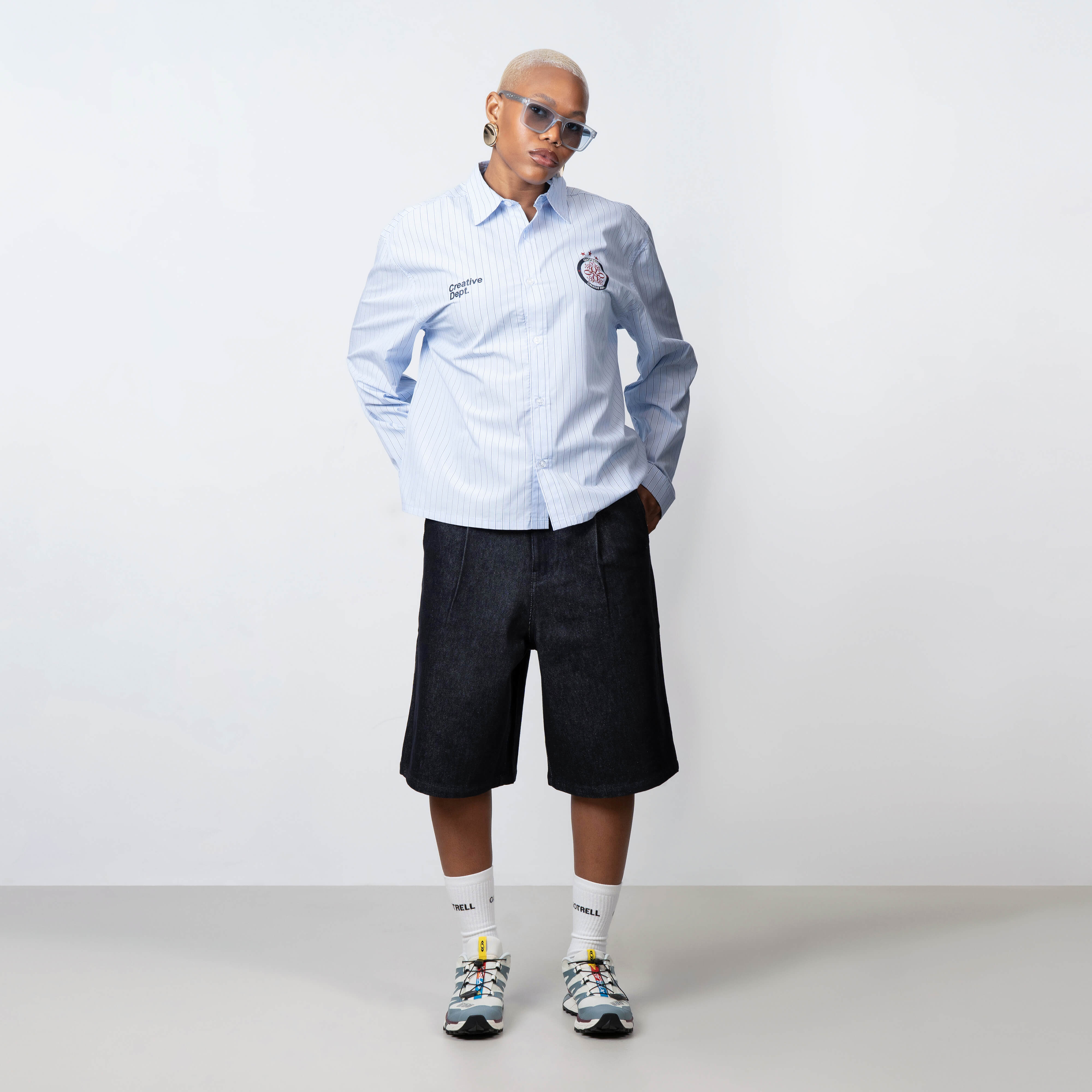 • The Club Shirt combines a clean tailored look with a modern streetwear edge. Designed in a lightweight fabric with a subtle striped pattern, it features a relaxed fit and classic button closure for effortless wear. Embroidered details on the chest, including the Creative Dept. text and signature emblem, add a distinctive touch. A versatile piece that blends smart and casual style for everyday outfits.