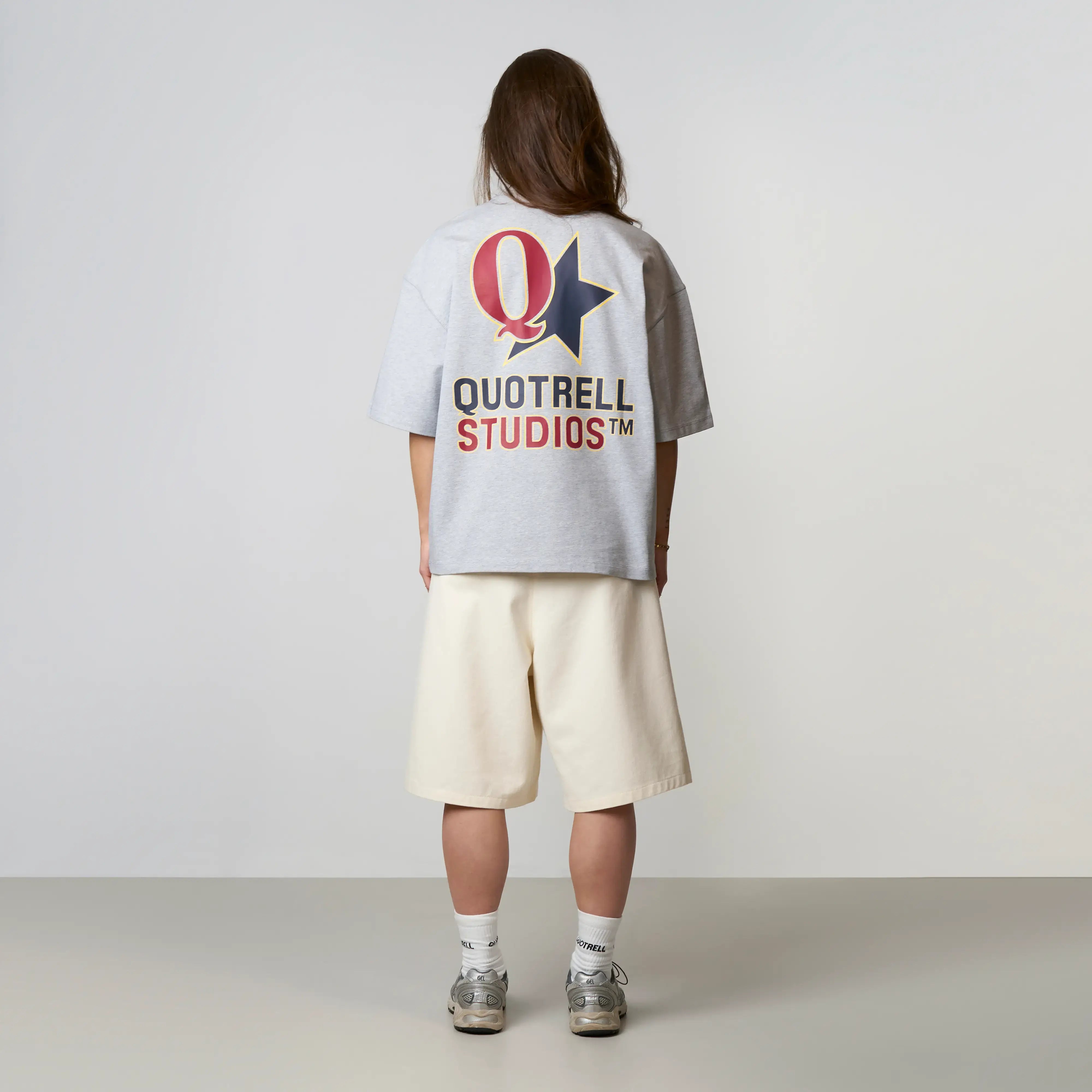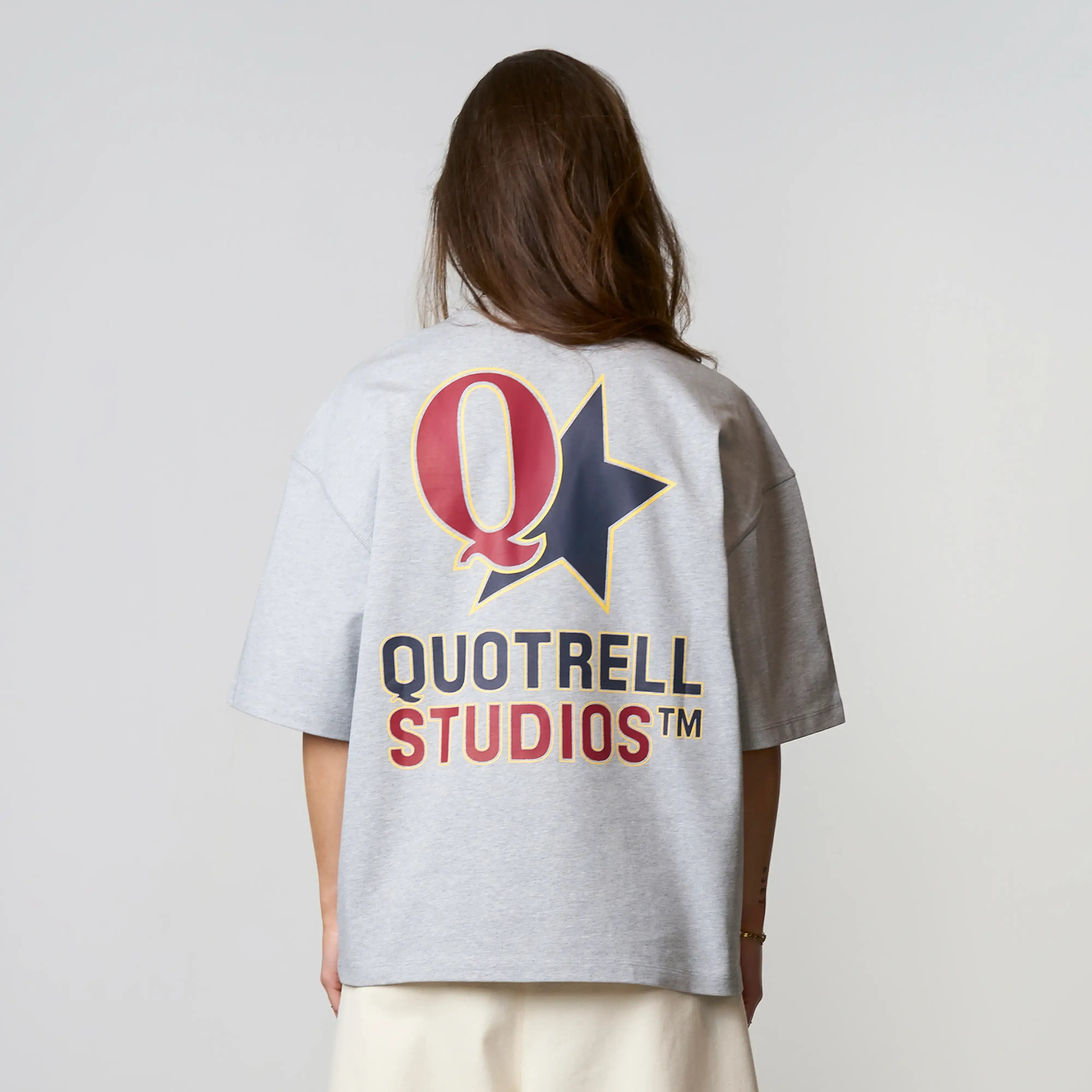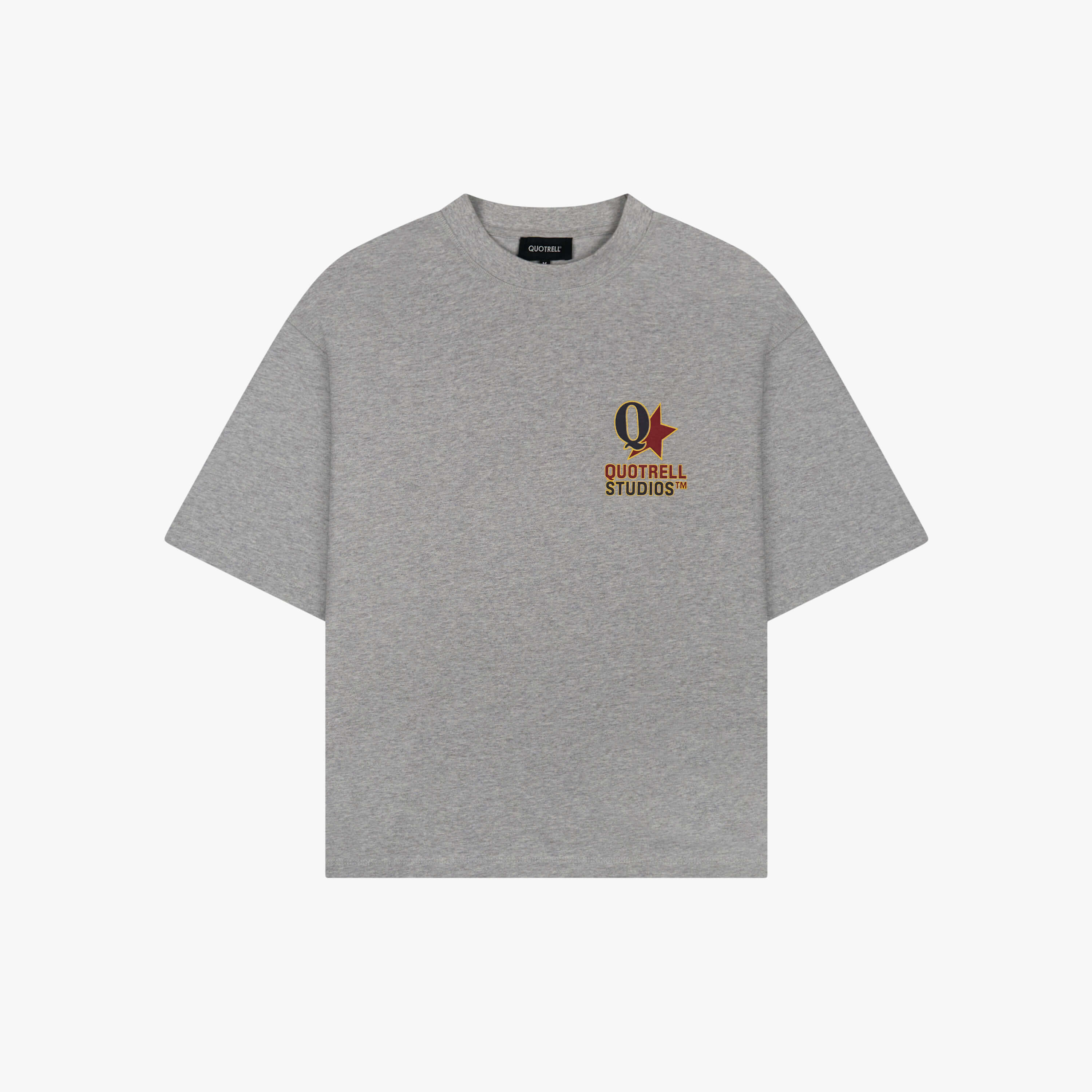 The Carmine Tee features a cropped oversized fit with a soft cotton fabric for everyday comfort. Designed with a clean front and subtle Quotrell Studios branding for a minimal look. The back stands out with a bold graphic logo print, adding a strong and recognizable statement. A versatile tee that combines comfort with a modern streetwear aesthetic.