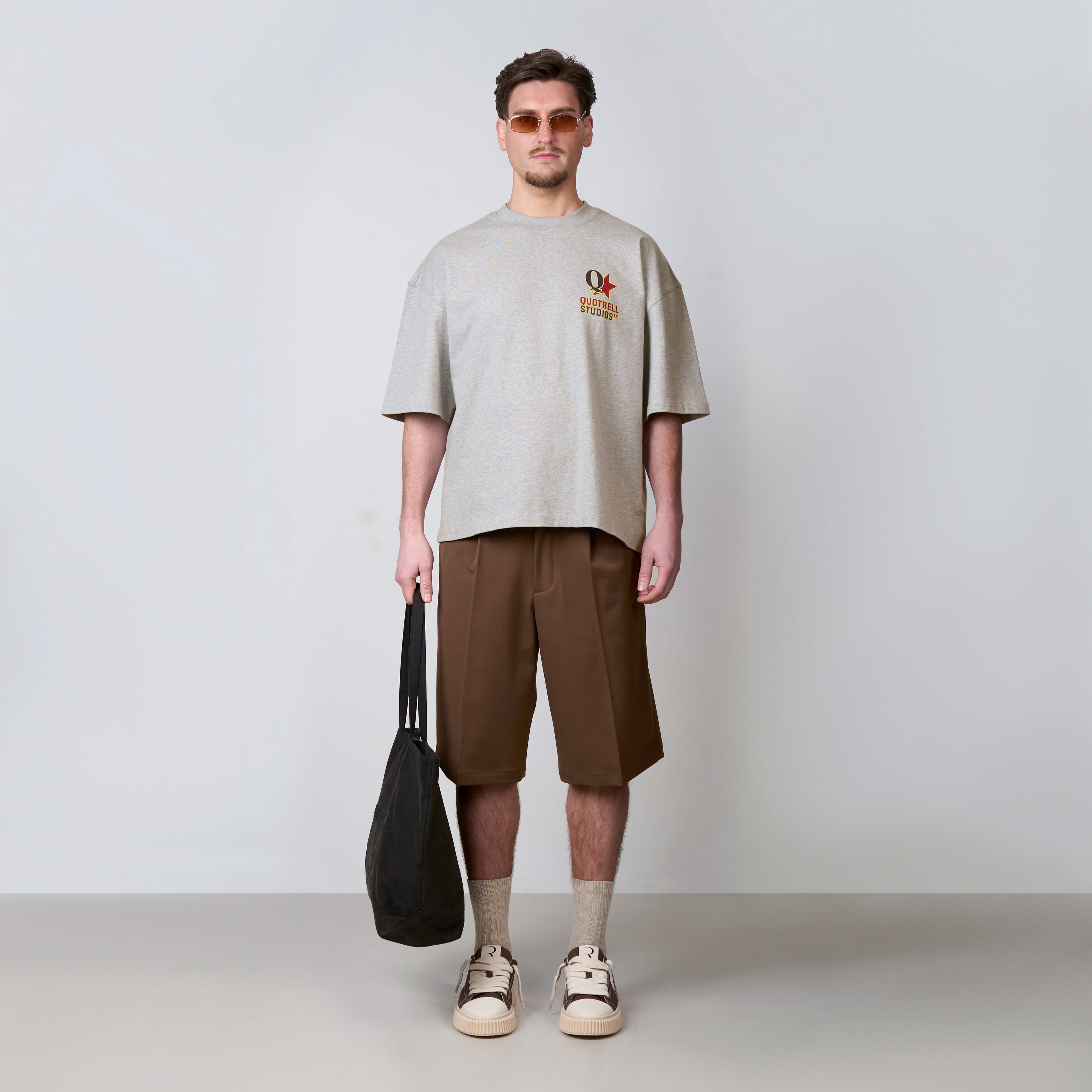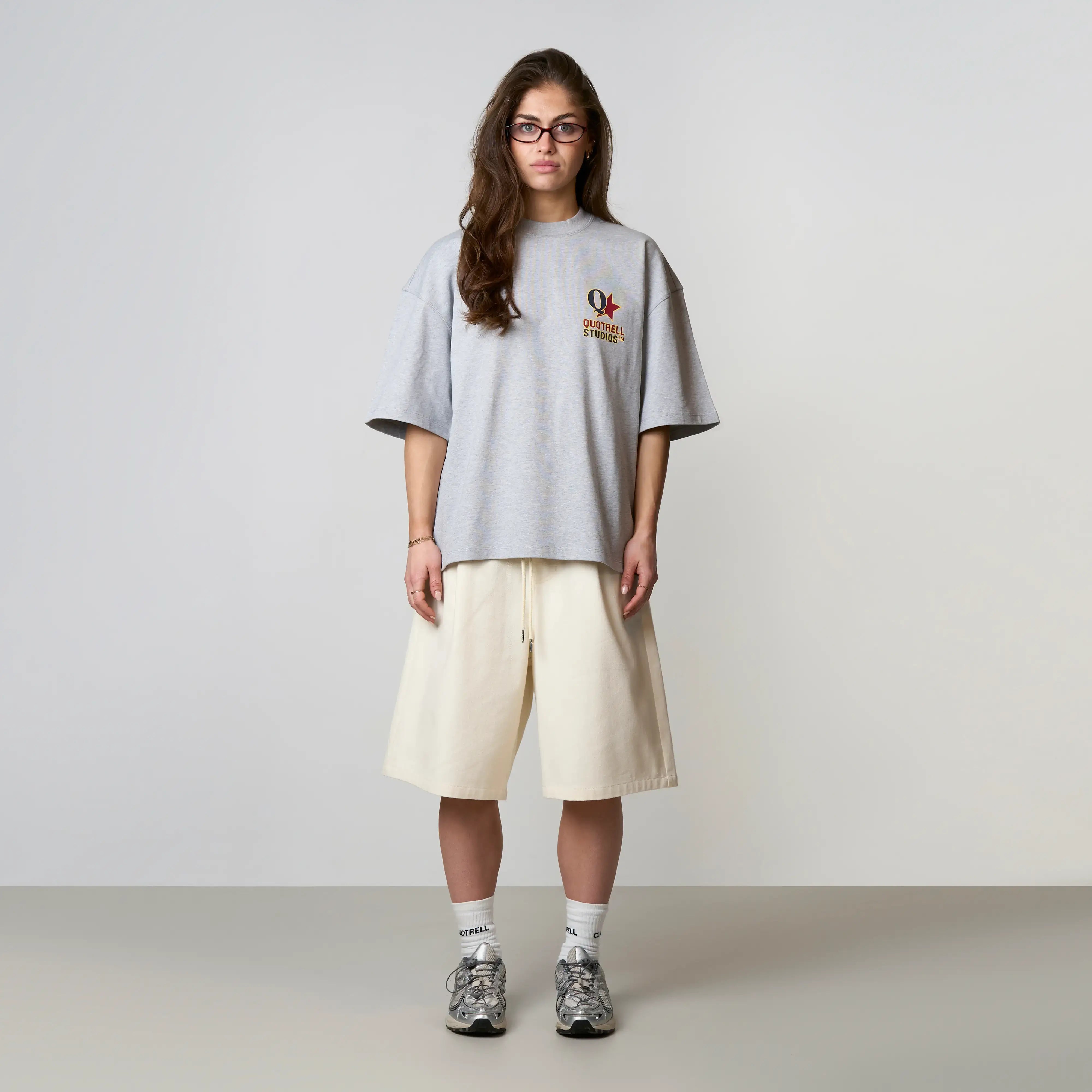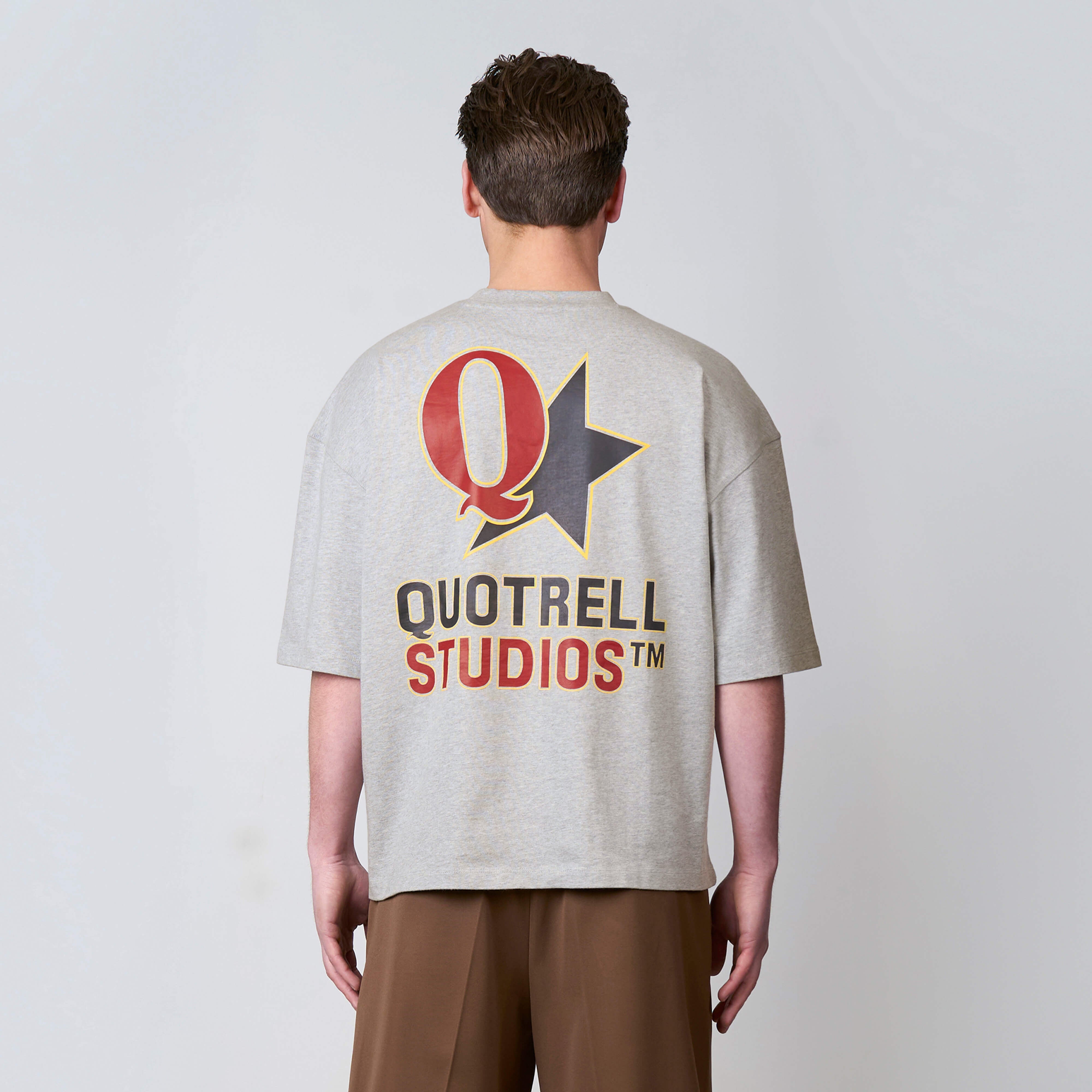 The Carmine Tee features a cropped oversized fit with a soft cotton fabric for everyday comfort. Designed with a clean front and subtle Quotrell Studios branding for a minimal look. The back stands out with a bold graphic logo print, adding a strong and recognizable statement. A versatile tee that combines comfort with a modern streetwear aesthetic.
