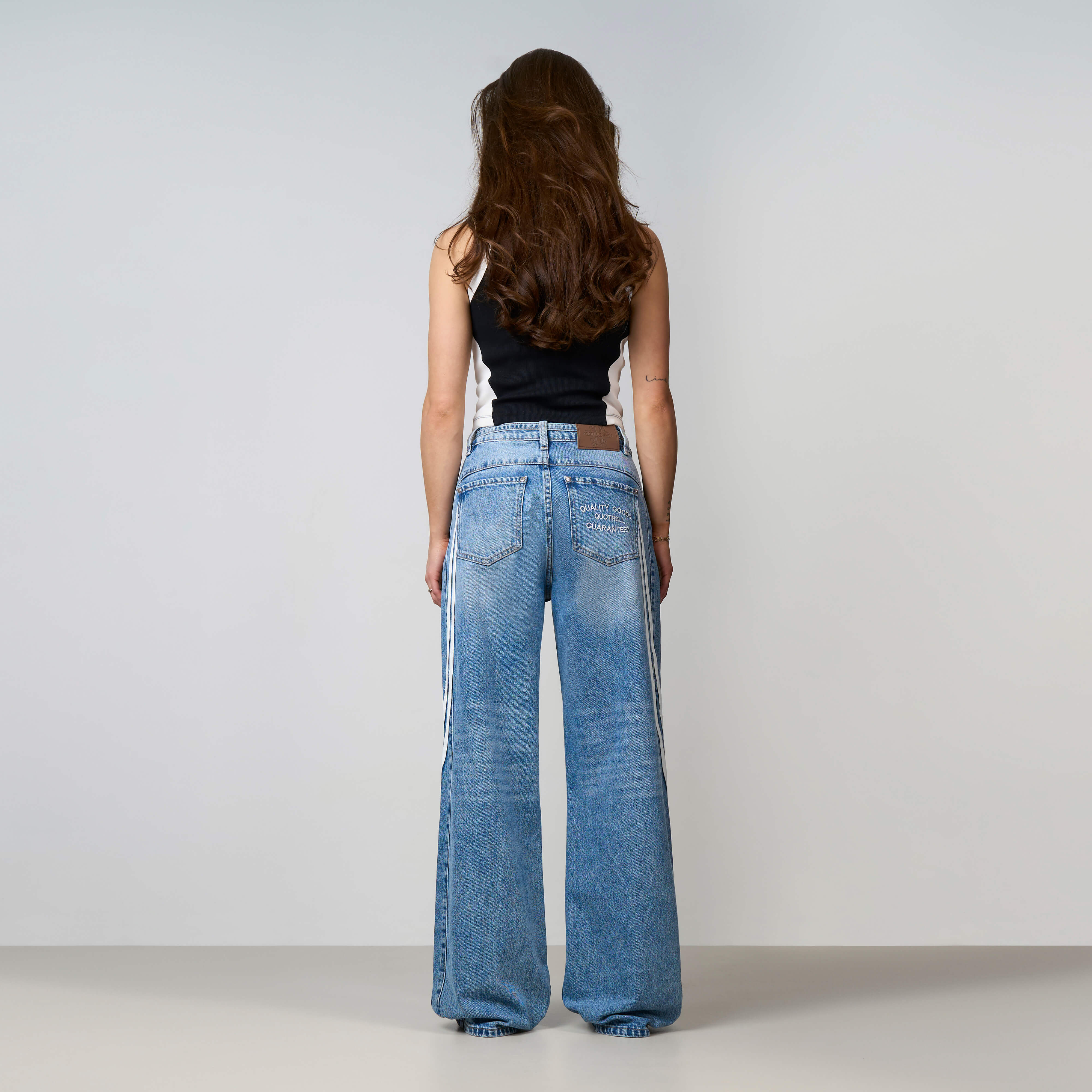 The Cleo Denim Jeans feature a wide leg mid waist fit with premium denim construction for a structured yet comfortable feel. Designed with a classic button and zip closure, five pocket styling, and extended drawstring details at the waistband for a distinctive streetwear edge. Side stripe accents along the legs create a bold, sporty silhouette, while subtle branded detailing on the back pocket adds a signature finish. A statement denim piece that blends modern streetwear attitude with everyday versatility.