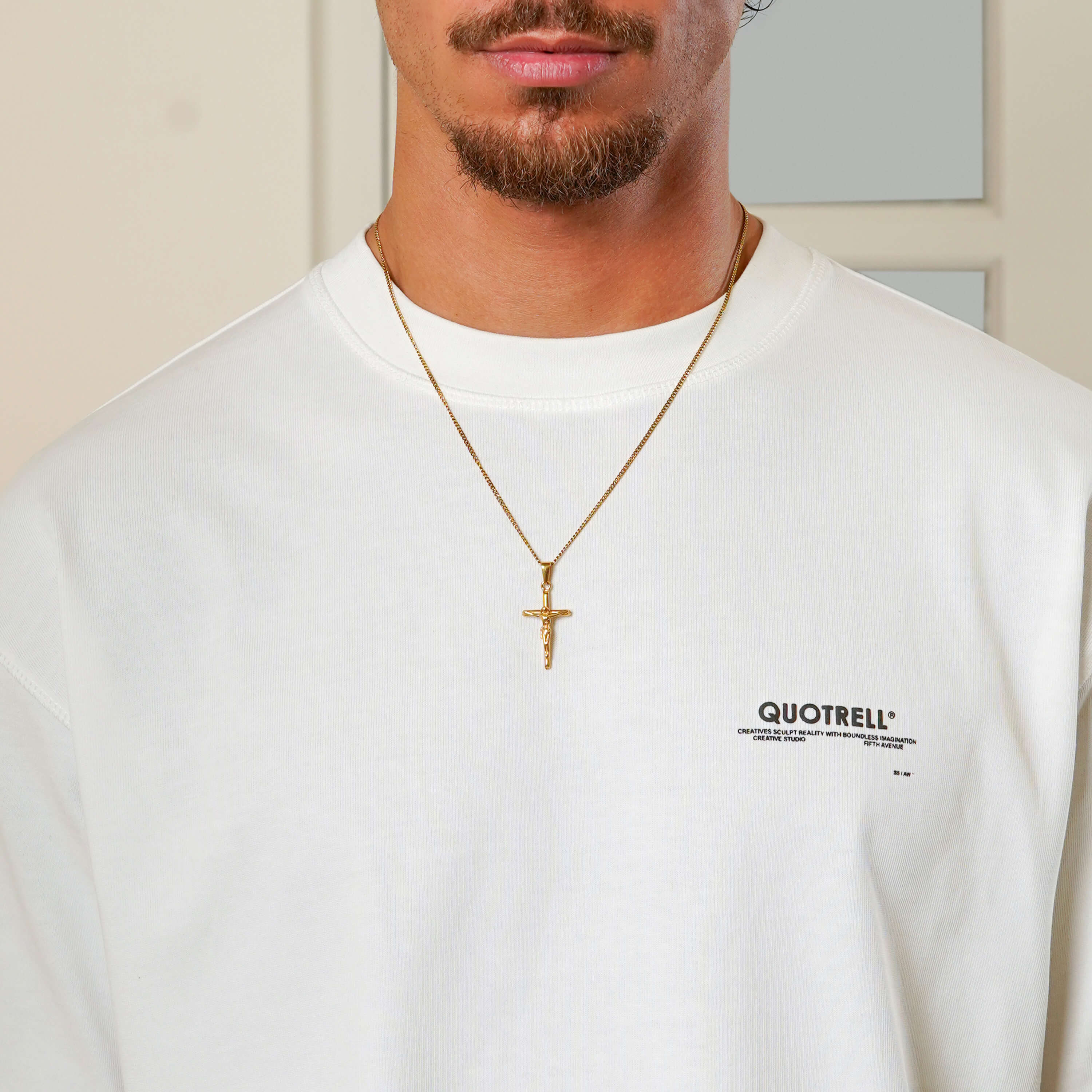 Gefertigt für jene, die ohne Entschuldigung leben, ist diese Kreuzhalskette für Männer perfekt für den täglichen Gebrauch oder zum geschichteten Tragen. Das dezente Quotrell-Zeichen verleiht den letzten Schliff, während die robuste Verarbeitung sicherstellt, dass sie mit jeder deiner Bewegungen Schritt hält.