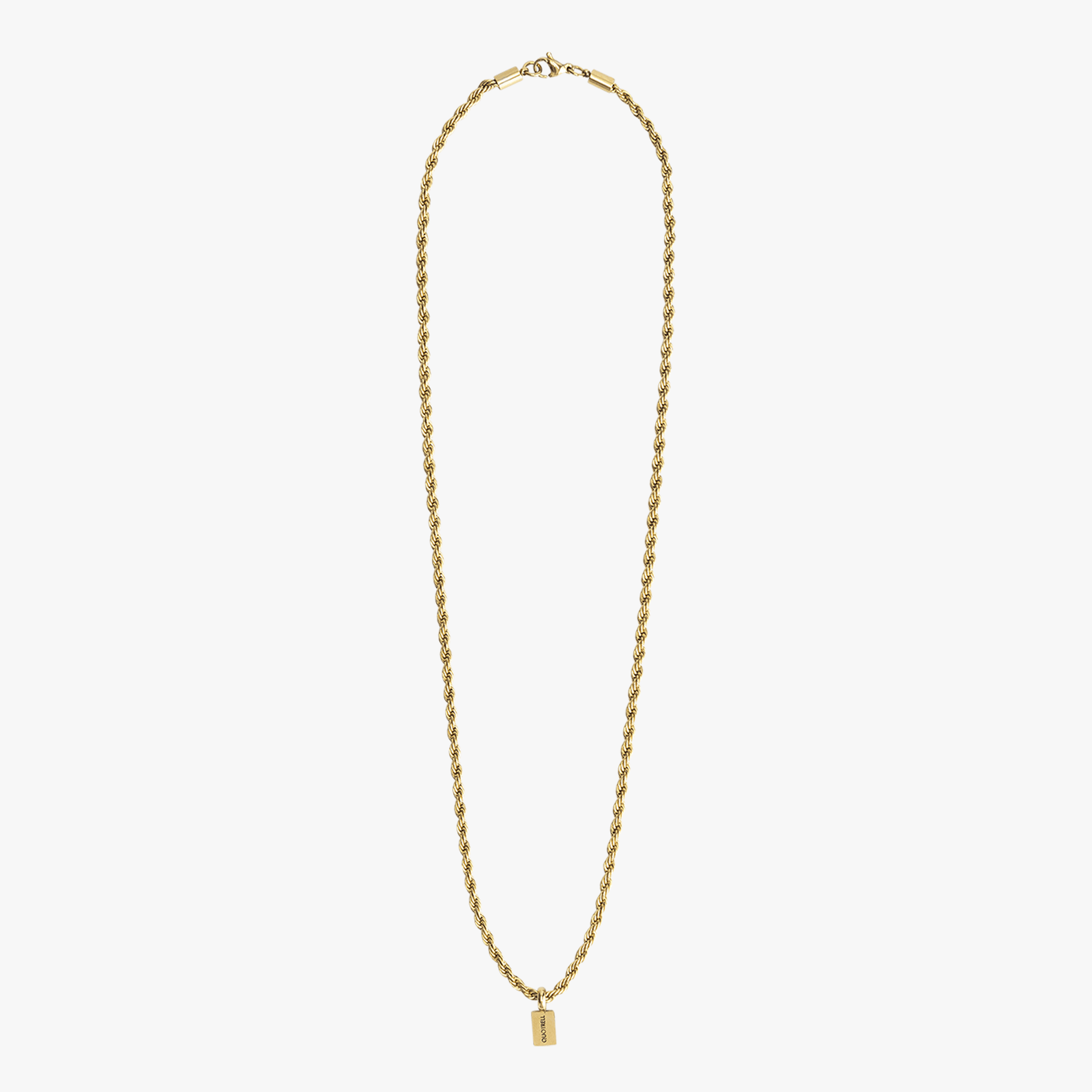 Unsere Seilkette ist die perfekte Ergänzung zu jedem Outfit. Erhältlich in Gold- und Silber-Edelstahl, ist diese Herrenkette mit einem gedrehten Kordelglied versehen. Der dezente Anhänger zeigt auf der einen Seite unser Quotrell Couture-Logo und auf der anderen Seite dezent unseren Markennamen. Die Seilkette ist in zwei Längen erhältlich (50 cm und 60 cm) und verfügt über einen Verschluss am Hals.